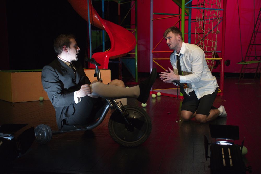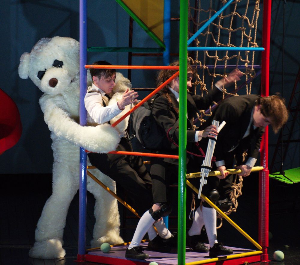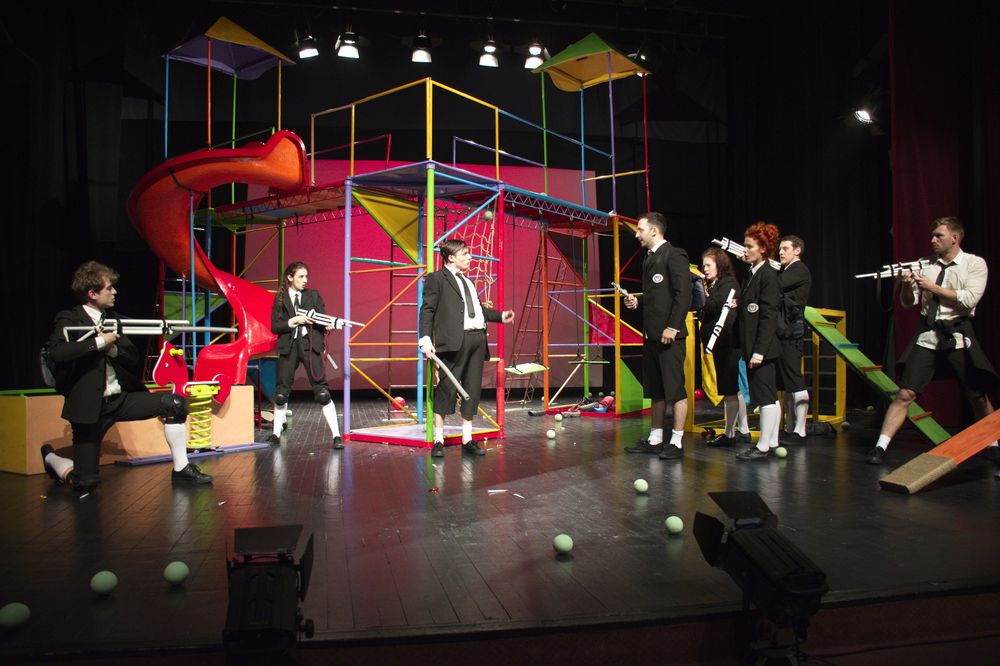 Patafizica (ştiinţa lucrurilor imaginare, cum o defineşte Alfred Jarry), prinde contur prin acest joc de copii, spaţiul de joc şi obiectele jocului metamorfozându-se: leagănul ar putea fi tron sau dispozitiv de tortură, bomboanele – monedă de schimb, ansamblul de joacă este Polonia sau peştera în care se ascunde Dom’ Ubu de armata rusă.