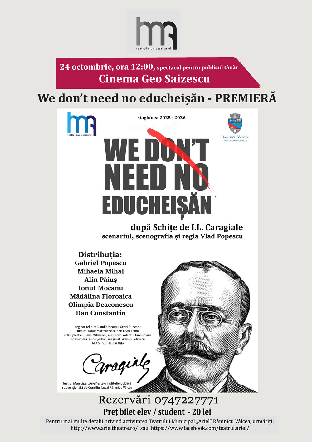 Teatrul Municipal „Ariel” prezintă o premieră pentru publicul tânăr - We don't need no educheișăn, după „Schițe” de I.L. Caragiale -